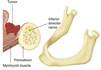• In patients with teeth, the tumor extends through the dental socket into the cancellous part of the bone and invades the mandible in that fashion (Figure).
