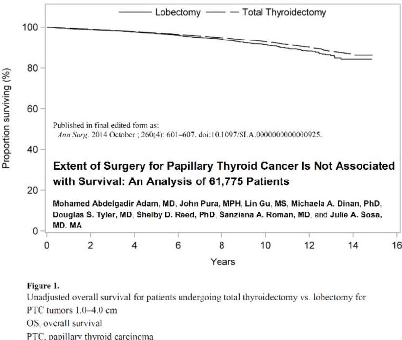 👉For patients with thyroid cancer less than 4 cm in size and without extrathyroidal extension or lymph node or distant metastases, either thyroid lobectomy or thyroidectomy have equivalent survival.