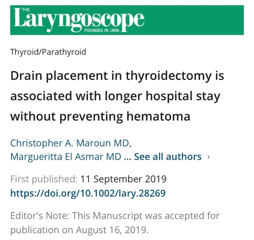 👉Drain placement in thyroidectomy is associated with longer hospital stay without preventing hematoma based on the results of an article published in Laryngoscope September 2019.