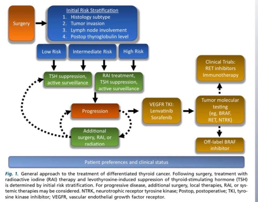 👉La estratificación del riesgo, basada en la patología, la biología del tumor, las evaluaciones bioquímicas y de imagen continuas, y las comorbilidades del paciente, ahora forman la base esencial del manejo del cáncer de tiroides diferenciado con un imperativo para proporcionar atención individualizada y apropiada para la enfermedad.