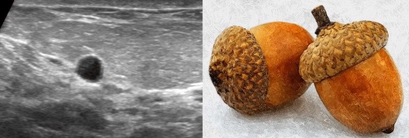 👉The nodule in an acorn cyst is less echogenic than papillomas or papillary carcinomas, is usually concave, following the contour of the cyst (thus the appearance of a cap on an acorn) instead of convex, and does not have a vascular stalk.