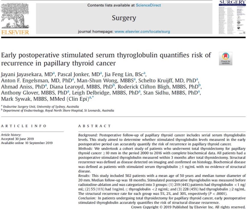 👉Stimulated postoperative thyroglobulin (Tg) level before radioactive iodine ablation (RAI) can be used to quantify risk of papillary thyroid cancer (PTC) recurrence.