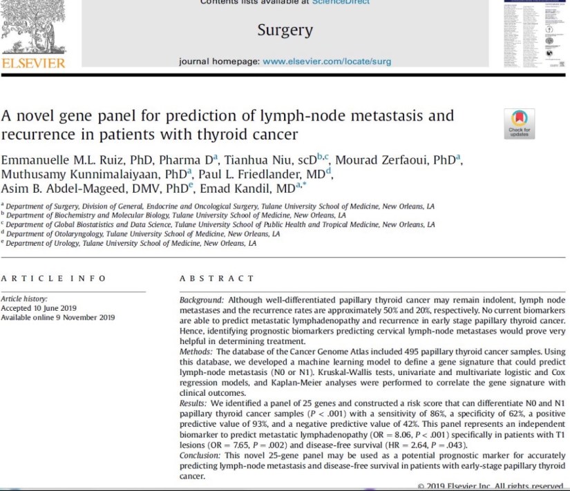 👉A novel 25 gene panel can be used to predict LN metastasis in early #papillary thyroid cancer (OR = 8.06, P < .001) and disease-free survival (HR = 2.64, P = .043).