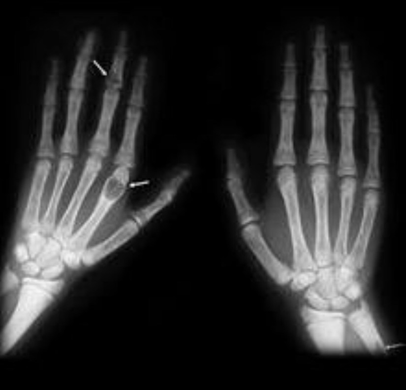 👉An extreme form of parathyroid bone disease termed osteitis fibrosa cystica is characterised by significant loss of bone density, development of bone cysts and brown tumors (shown below), skeletal deformity, bone pain, and a propensity for pathologic fractures.