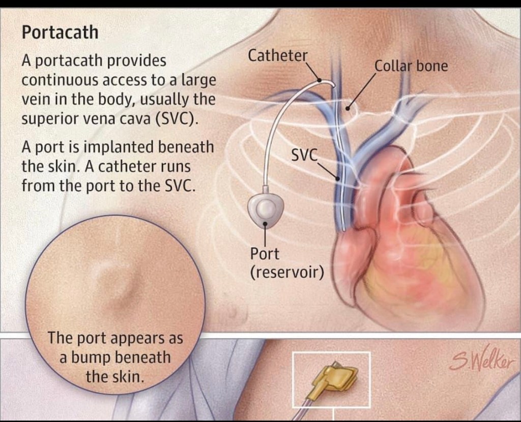 👉A portacath or “port” provides intravenous access to a large vein in the body to deliver chemotherapy, blood products, antibiotics, and IV fluids.