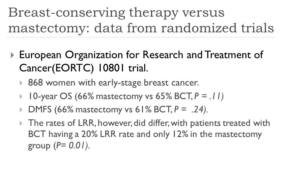 👉The EORTC Trial 10801 was a randomized multicenter trial that compared breast-conserving therapy with MRM for patients with invasive breast cancer less than 5 cm in diameter.