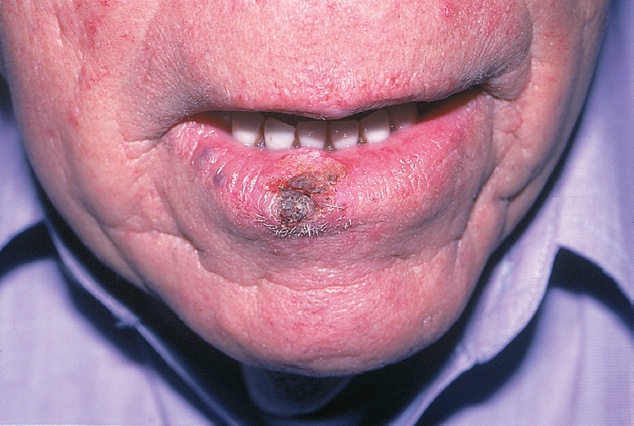 - The most common lesion is found on sun-damaged skin: