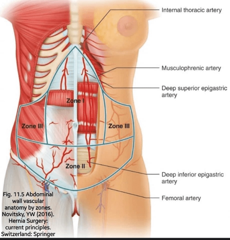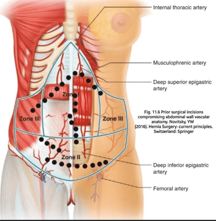 - When evaluating a patient who requires ventral herniorrhaphy, the blood supply to each zone should be considered as it may be comprised by prior surgical incisions (such as a panniculectomy or paramedian incision) or prior surgical procedure (such as epigastric ligation or abdominal aortic aneurysm repair)