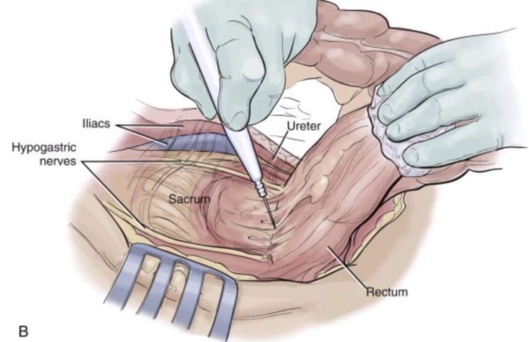🔴Dissection is along the avascular alveolar plane between the presacral and mesorectal fascia, described as holy plane (Heald’s “holy plane”).