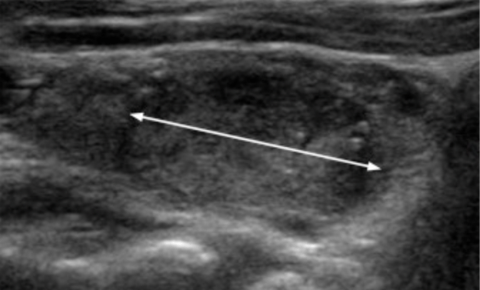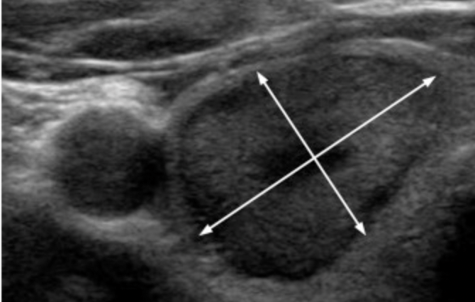 - Accurate sizing of thyroid nodules is critical, as the maximum dimension determines whether a given lesion should be biopsied or followed