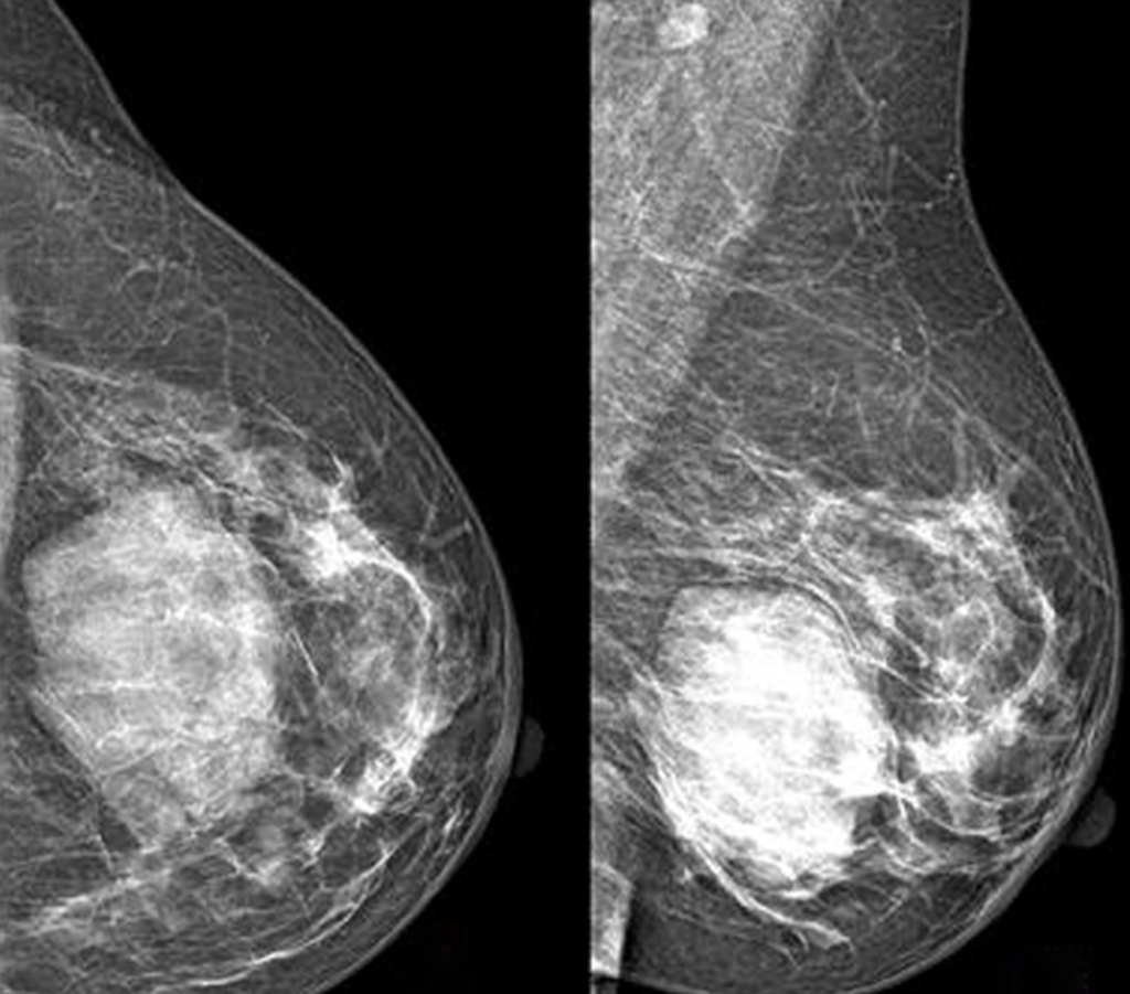 Image: Mammography performed with craniocaudal (A) and mediolateral oblique (B) incidences of the left breast shows a huge well-defined mass located between the inner and the outer inferior quadrants, with no suspicious features