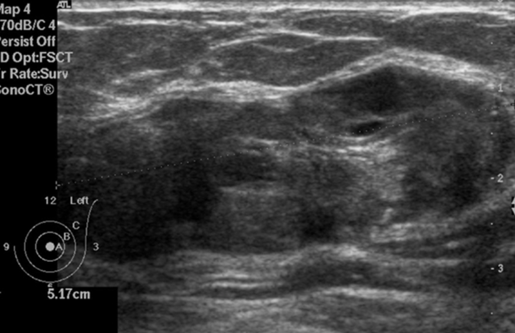 Image: Ultrasound of the left breast centered on the palpable lump showing an oval, heterogeneous lesions with smooth borders.