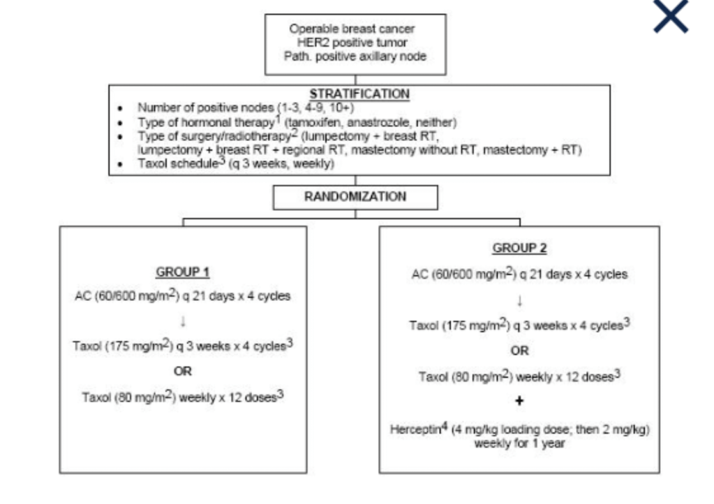 - Doxorubicin and cyclophosphamide followed by paclitaxel every 3 weeks (group 1) with the same regimen plus 52 weeks of trastuzumab given concurrently with paclitaxel (group 2).