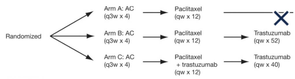 - Doxorubicin and cyclophosphamide followed by weekly paclitaxel, followed by 52 weeks of trastuzumab given after paclitaxel