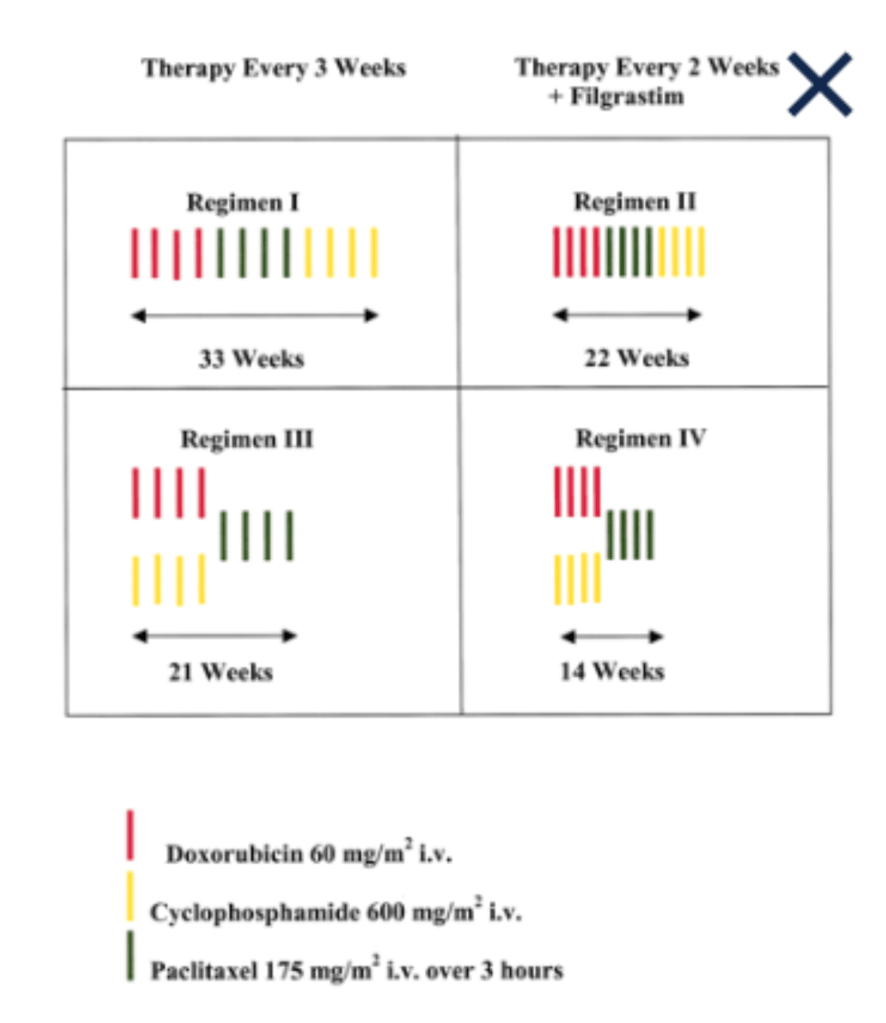 • Dose-dense, sequential A then C then T x 4 cycles every 2 weeks with filgrastim