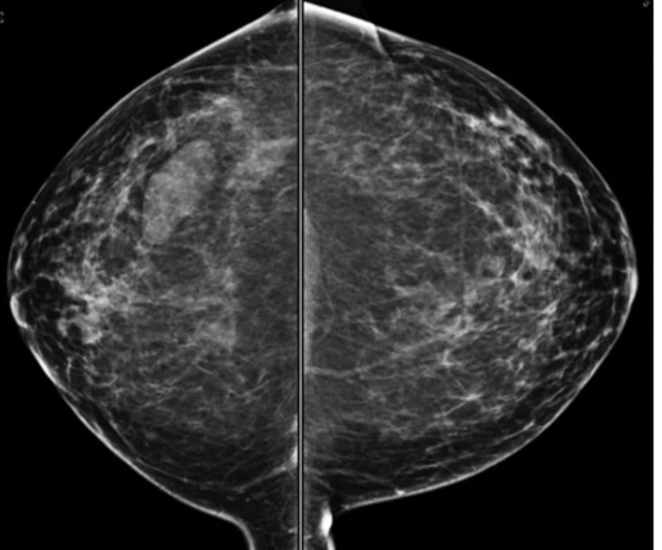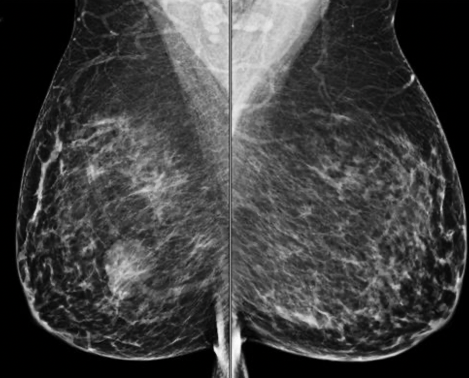 Imaging: bilateral MLO and CC views of the breasts. There is an ovoid mass in the right lower, outer quadrant.