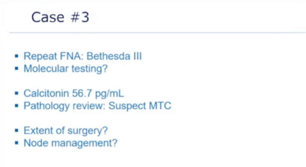Family history, pathologist stain for calcitonin, CEA, rule out MEN Type II, genetic testing and counseling (before or after surgery?), plan surgery (total thyroidectomy central neck compartment dissection)