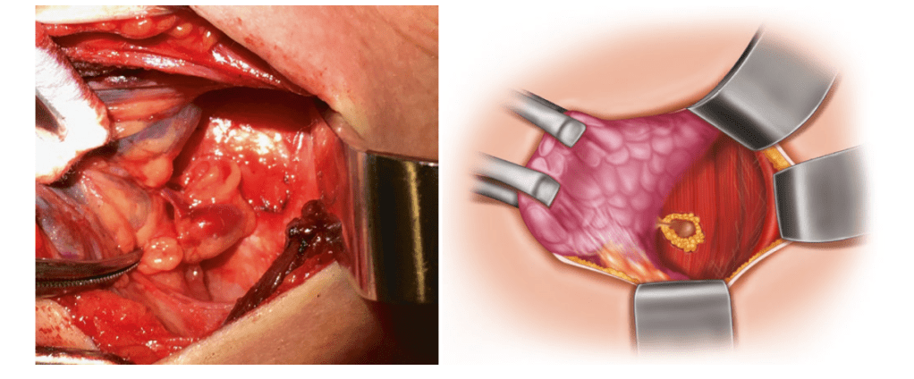Exposure of the vascular pedicle. The gland has been dissected away from the surrounding tissue to expose its supplying vascular pedicle, which can then be ligated with a bipolar cautery or a small clip. The position of the recurrent laryngeal nerve, which can be seen in the bottom of the image, should be re-confirmed during this stage