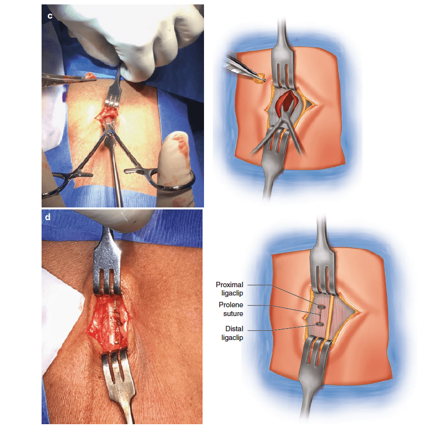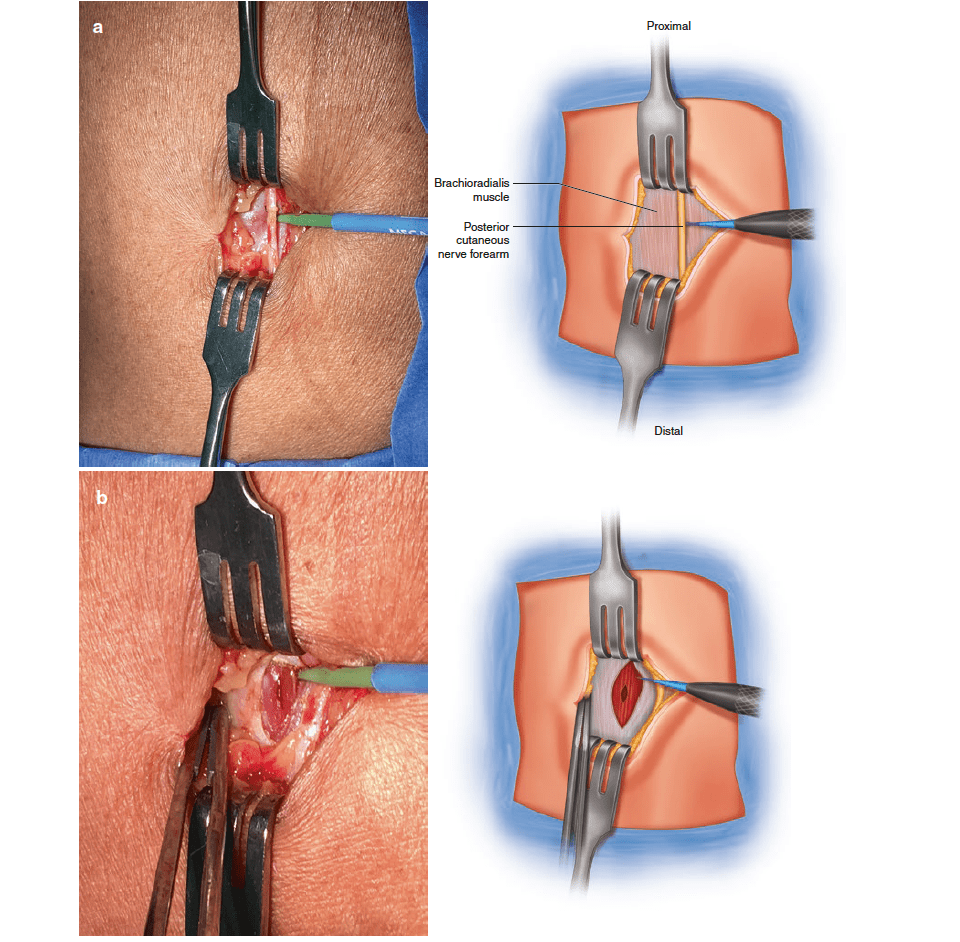 Procedure for auto-transplant into brachioradialis. Theseimages demonstrate the steps taken to transplant an abnormal parathyroidgland into the right brachioradialis muscle of a patient with tertiaryhyperparathyroidism. (a) A 2-cm incision is made over the brachioradialismuscle approximately 5 cm distal to the cubital crease. The dissectionis continued down to the deep fascia, with care taken to identifyand protect the posterior cutaneous nerve of the forearm (a). (b) Thefascia is incised and a 1-cm pocket is created in the muscle. (c) Themorcellated parathyroid tissue is placed into the pocket. (d) The fasciais closed, and the position of the auto-transplant is marked with a Hemoaclip at its proximal and distal extent, and a Prolene suture betweenthese