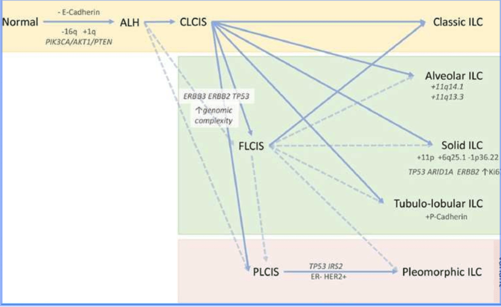 A lineage of ‘lobular’ disease evolves from a normal epithelial cell on a background of a loss of E-cadherin expression and function, and key early somatic alterations involving gain of chromosome 1q, loss of 16q, and mutations in PIK3CA, AKT1, or PTEN.