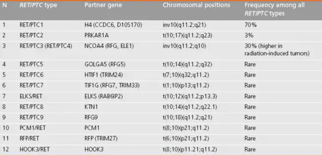 RET / PTC rearrangement is another genetic alteration that is frequently found in papillary thyroid carcinomas (PTC), and is a result of the fusion between the 3´-portion of the RET receptor tyrosine kinase gene and the 5´-portion of various genes.