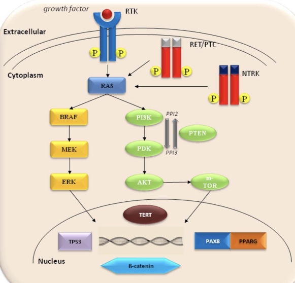 The PI3K / Akt signaling pathway plays an important role in the regulation of cell growth, proliferation and survival. This pathway can be activated by the upstream stimulatory molecules (i.e., RAS, RET /PTC), through the loss of function of PTEN protein that normally inhibits PI3K signaling or as a result of activating mutations or amplification of genes coding for the effectors of this pathway.