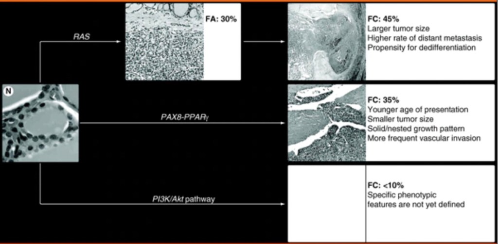The most frequent genetic alterations in follicular thyroid carcinomas (FTC) include point mutations of the RAS genes and PAX8 / PPARγ rearrangement (Figure).