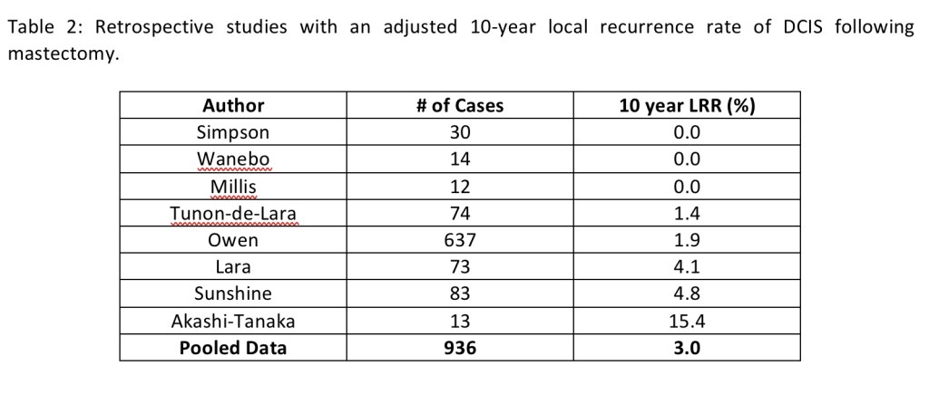 - Confirming the very low recurrence rate for DCIS treated with mastectomy