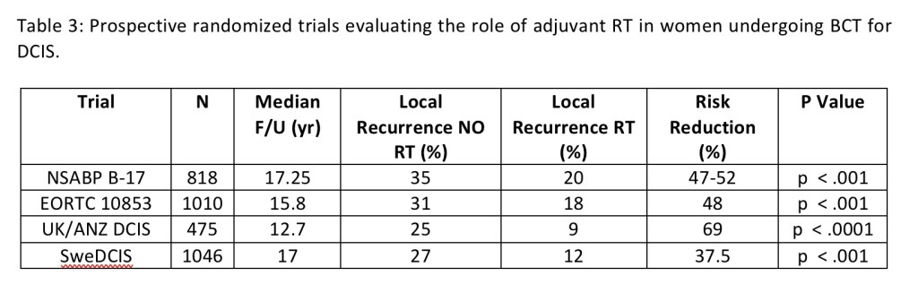 Table 3: Prospective randomized trials evaluating the role of adjuvant RT in women undergoing BCT for DCIS.