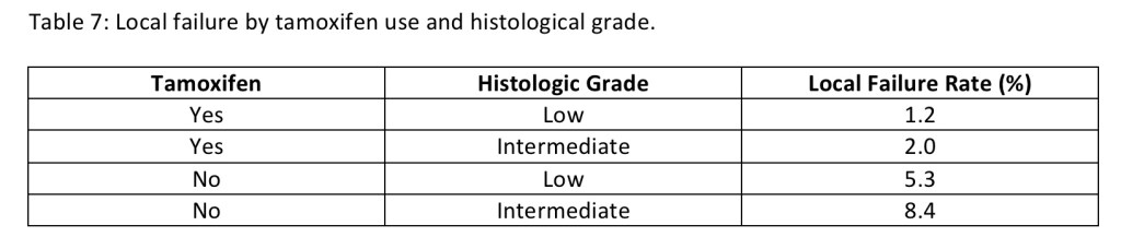 - Table 7 demonstrates the LF rate based on histologic grade and tamoxifen use