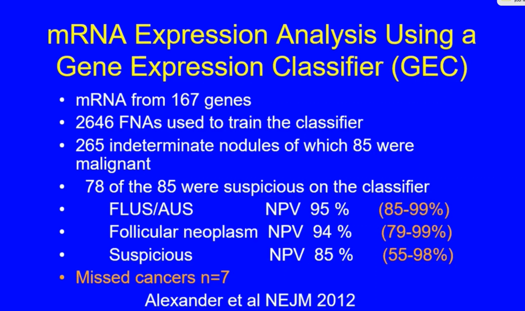 - A gene expression classifier (GEC) was developed through an iterative process that intended for the test to have a high sensitivity and a high negative predictive value (NPV), analogous to the NPV of thyroid nodules diagnosed as benign on cytology