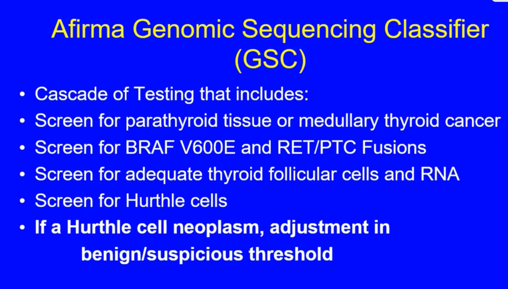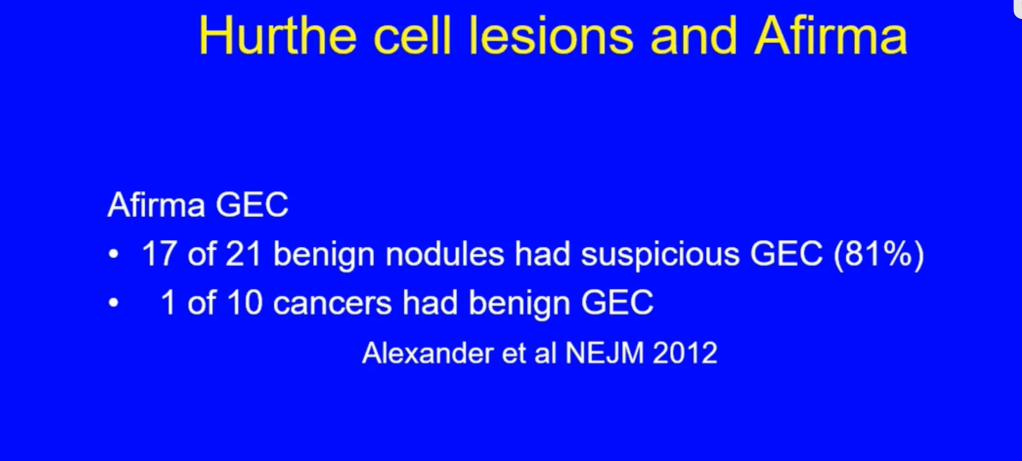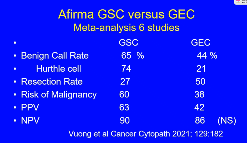 - The Afirma GEC accomplished a high sensitivity (measures the fraction of cancers that it identifies as positive) and NPV (measures the fraction of “negative” calls by the test (Afirma GEC benign) that are correct), including among indeterminate thyroid nodules