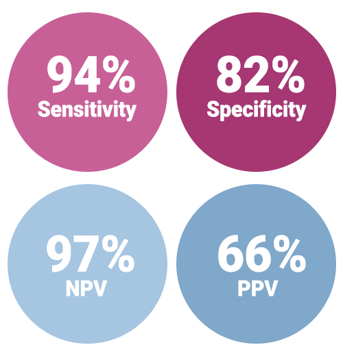 - Highest NPV (97%) and PPV (66%) among well validated tests
