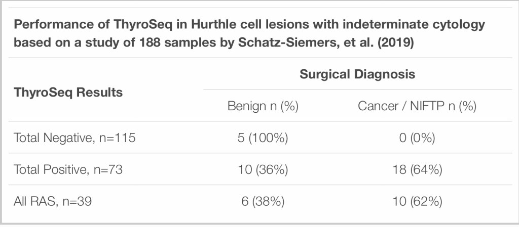 - Which means ThyroSeq had 100% NPV for Hurthle cell lesions that went to surgery in this study