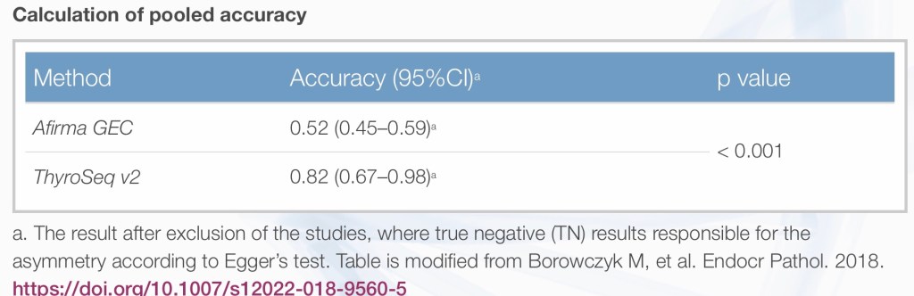 - An independent review study that analyzed data from studies of ThyroSeq v2 and Afirma GEC found that ThyroSeq had “significantly higher specificity and accuracy with an acceptable sensitivity so that it has the potential for use as an all-round test of malignancy of thyroid nodules.”