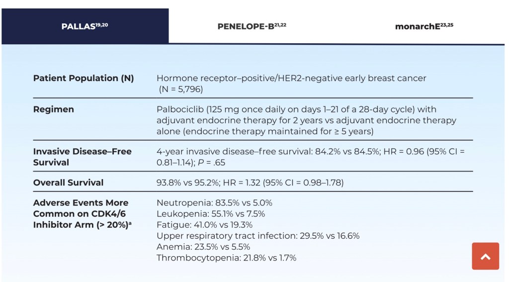 - No statistically significant benefit was seen with palbociclib for 4-year invasive disease–free survival or other survival endpoints (Table)