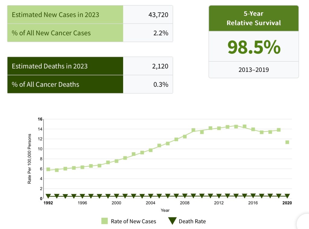 - In 2023, it is estimated that approximately 2120 cancer deaths will occur among persons with thyroid carcinoma in the United States