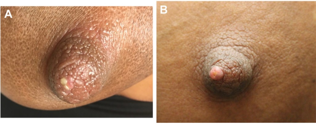 - Small white, yellow, or red blisterlike lesions on the surface of a nipple