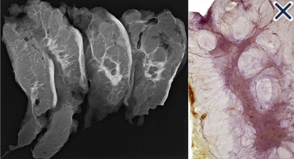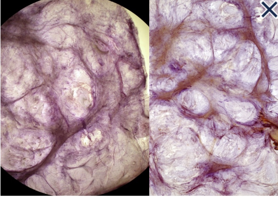 - Show how growth of the mesenchymal tissue distorts the normal, harmonious connective tissue framework by causing nonuniform thickening of the fine sheets of connective tissue (Images 3a -b)