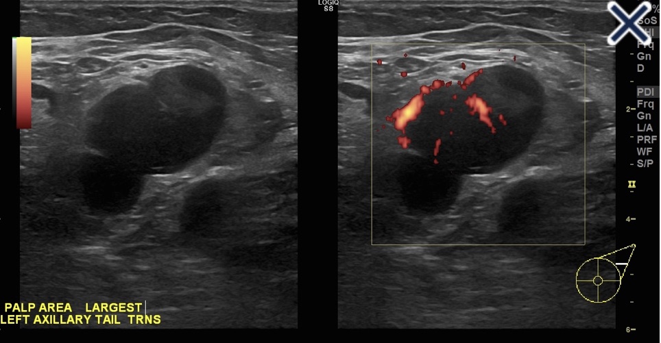 Lymph node completely replaced with metastatic carcinoma obliterating the fatty hilum. Doppler shows more than a single blood vessel supplying the node.