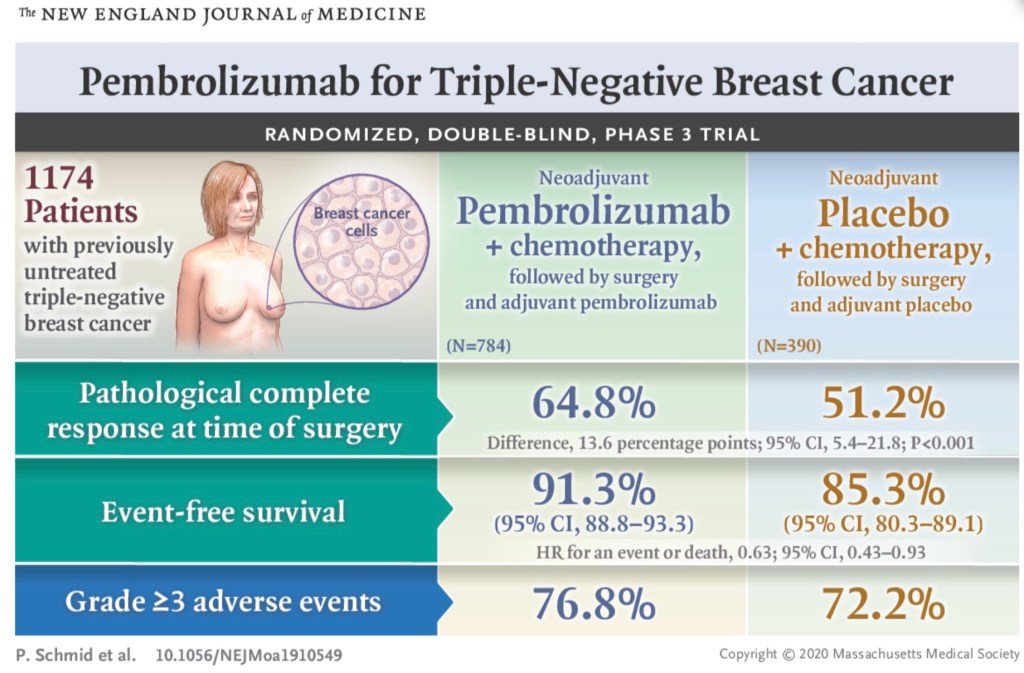 - Evaluated the efficacy and safety of neoadjuvant pembrolizumab–chemotherapy as compared with neoadjuvant placebo–chemotherapy, followed by adjuvant pembrolizumab or placebo in patients with early triple-negative breast cancer