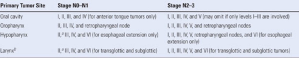 • Nodal coverage of levels I to III for oral cavity tumors and levels II to IV for oropharyngeal, hypopharyngeal, and laryngeal tumors: