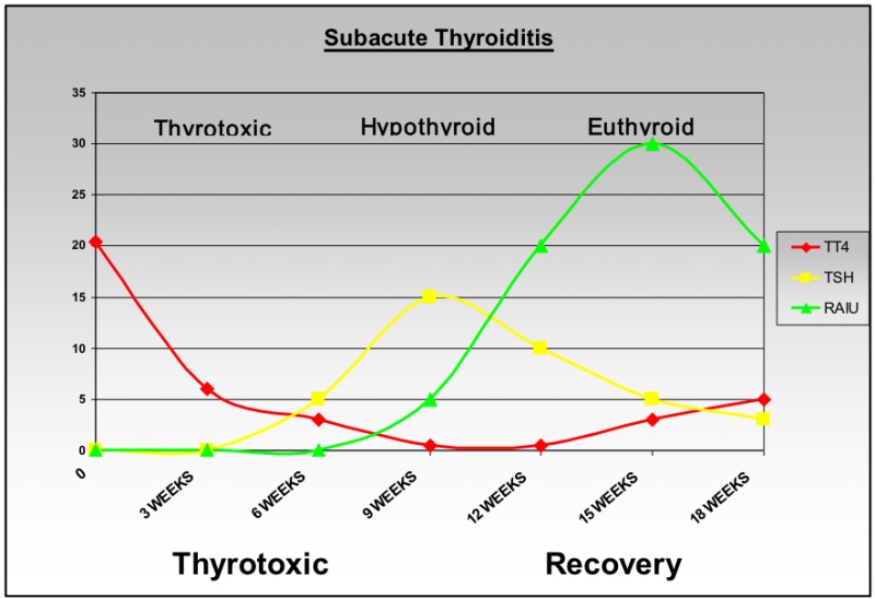 - Subacute thyroiditis (like painless sporadic thyroiditis and postpartum thyroiditis):