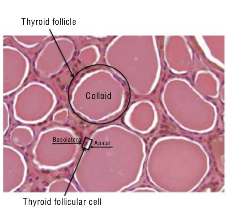 - The intracellularly accumulated iodide ion is then passively translocated across the apical membrane into the colloid protein aggregate: