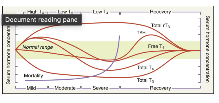 - The degree of serum rT3 elevation, depressed T3 / rT3 ratio, and decreased FT3 and FT4 concentrations: