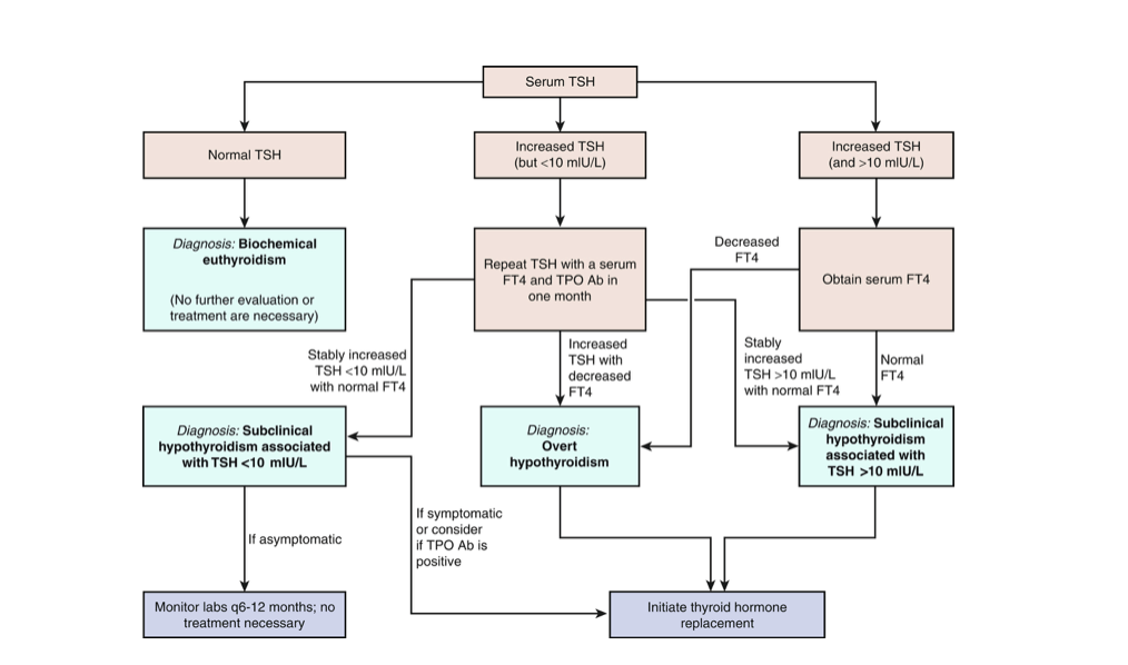 - May be determined with approximately 98% sensitivity and 92% specificity using serum TSH