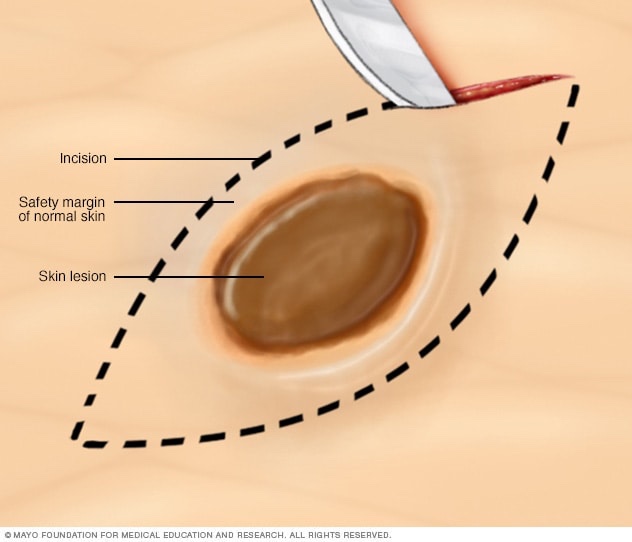 - A narrow margin of normal-appearing skin (1 to 3 mm) is taken with the specimen