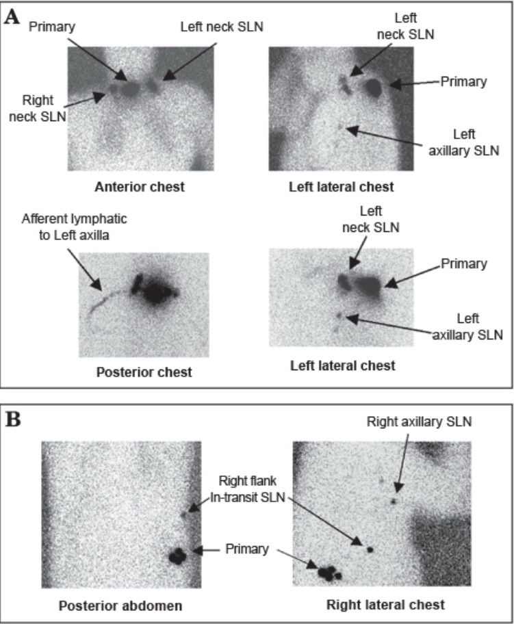 - Facilitates the identification of patients with multiple draining nodal basins and patients with lymphatic drainage to SLNs located outside standard nodal basins, including: