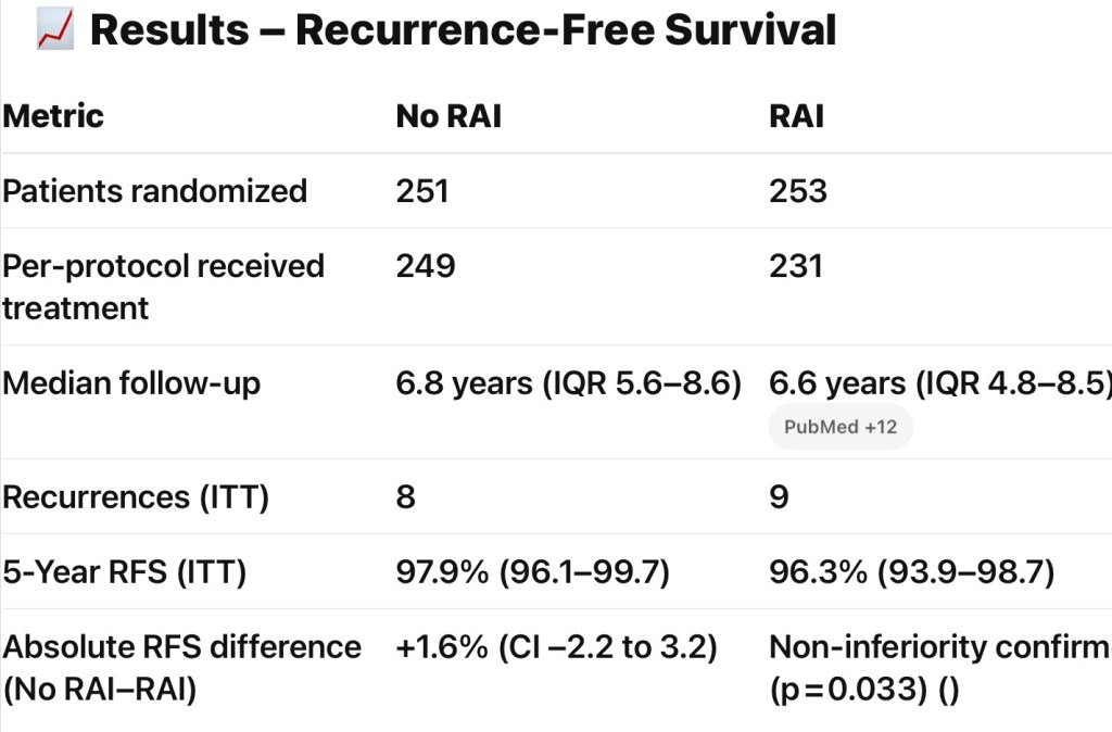 • RAI omission is safe in patients meeting strict criteria (pT1 to pT2, N0 / Nx, complete thyroidectomy):