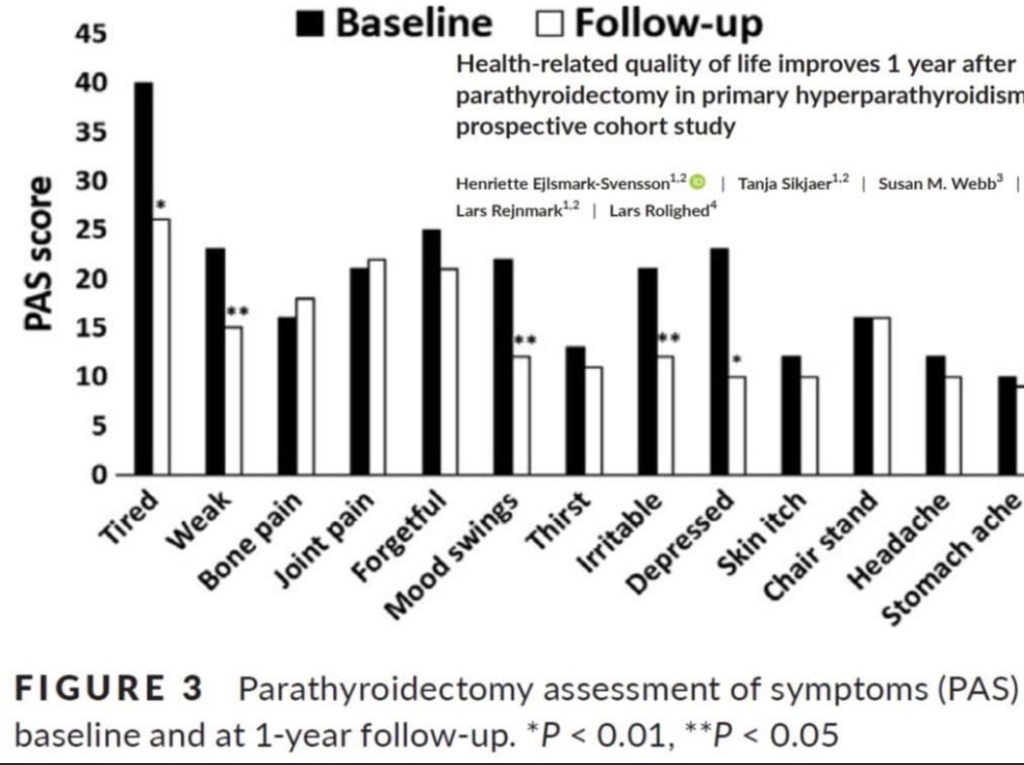 Health‐related quality of life commonly improves following parathyroidectomy for primary hyperparathyroidism.